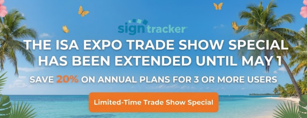 We just returned from the International Sign Association Expo in Orlando. We made a lot of new friends and welcomed new users to the SignTracker family. We’re extending our show special. Save 20% on your first year and 10% every year after when you sign up for a Growing Strong (3–5 users) or Large & In Charge (unlimited users) annual plan. Coupons are automatically applied to all new trials when you choose yearly billing.